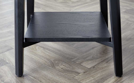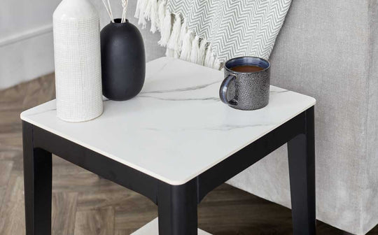 The Banks side table brings together cool white marbled ceramic and warm black wood in a design that's both practical and sophisticated. The luxurious marble-effect top with natural veining sits above a textured wooden frame, while an open shelf below keeps essentials within reach. Perfect beside your sofa or bed, this compact piece adds instant style to any corner.