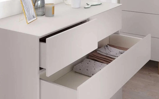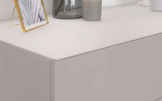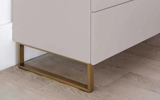 The Benton grey chest of drawers brings sophisticated storage to your bedroom with its sleek push-to-open drawers and striking brass legs. The luxurious velvet-lined top drawer keeps precious items protected, while etched glass detailing adds contemporary elegance. With generous storage across multiple drawers, this piece combines practical organisation with refined style for a clutter-free sanctuary.