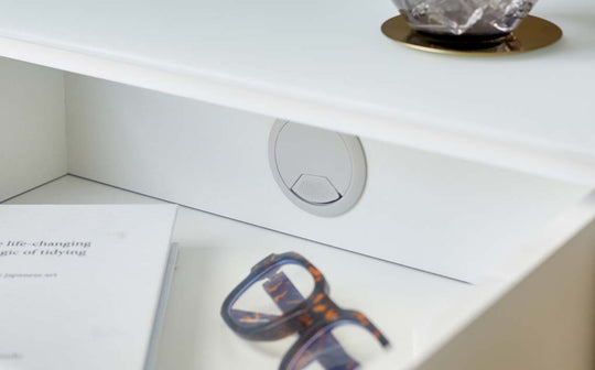 The Benton grey 2 drawer bedside table brings sophisticated storage to your bedroom with its sleek profile and considered details. A frosted glass top sits atop a grey frame, supported by brushed brass legs that add a touch of glamour. Two soft-close drawers keep bedside essentials organised, while built-in cable management ensures charging cables stay tidy.