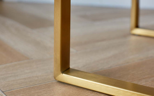 Close-up of a modern table leg, crafted from gold-coloured metal, showing sleek lines and a minimalist design.