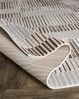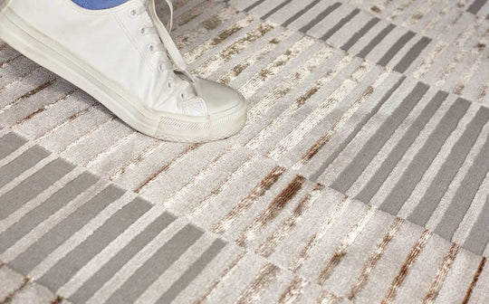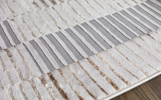 The Bijou mixed metallics textured large rug brings subtle glamour to your living space with its sophisticated blend of opulent hues and rich tones. Interwoven with high-shine metallic yarn, this large rug creates a captivating striped pattern where varying widths and shades add depth and intrigue to your floors.