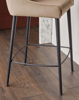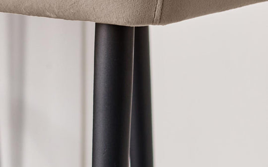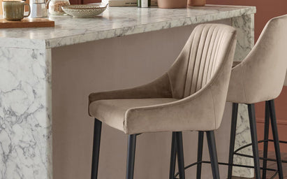 The Blakely champagne velvet bar stool brings sophisticated comfort to your kitchen island or breakfast bar. Upholstered in soft recycled velvet with a warm champagne tone, this exclusively designed piece features elegant panel detailing across the backrest. The sleek black metal legs create a striking contrast while ensuring stability for years of morning coffees and evening gatherings.