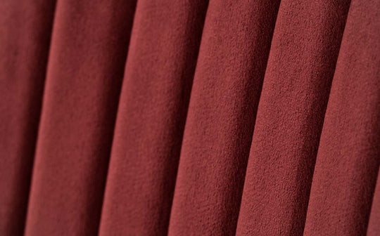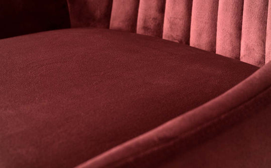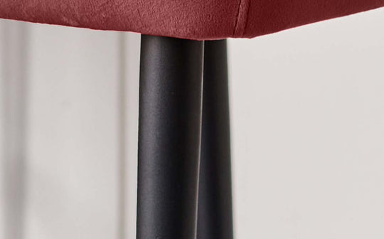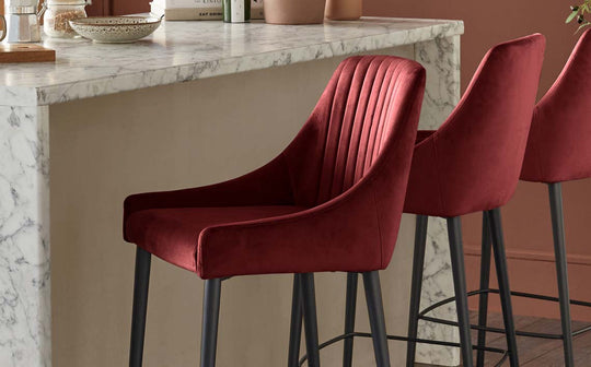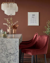 The Blakely toffee red velvet bar stool brings sophisticated comfort to your breakfast bar or kitchen island. Upholstered in rich toffee red recycled velvet with subtle vertical panelling, this exclusively designed piece features a generously padded seat and backrest. Four powder-coated metal legs provide sturdy support whilst floor protectors keep your surfaces pristine.