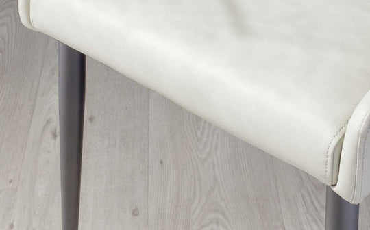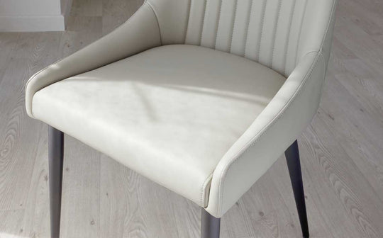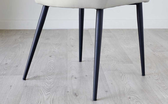 The Blakely light grey faux leather dining chair brings refined comfort to your dining space. Upholstered in soft, durable Durosoft faux leather with vertical ribbed detailing, this contemporary chair offers supportive cushioning for long dinner parties. The sleek black powder-coated legs create striking contrast, while built-in floor protectors keep your floors pristine.