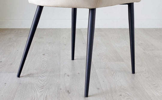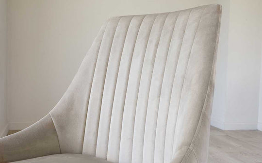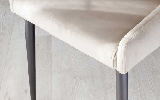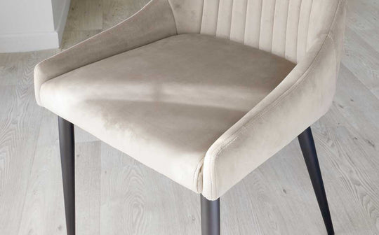 The Blakely champagne velvet dining chair brings sophisticated comfort to your dining space. Its curved silhouette and vertical ribbed detailing create visual interest, while plush cushioning ensures guests linger long after dessert. The striking black powder-coated steel legs add contemporary contrast, making this chair perfect for both formal dinners and casual kitchen gatherings.