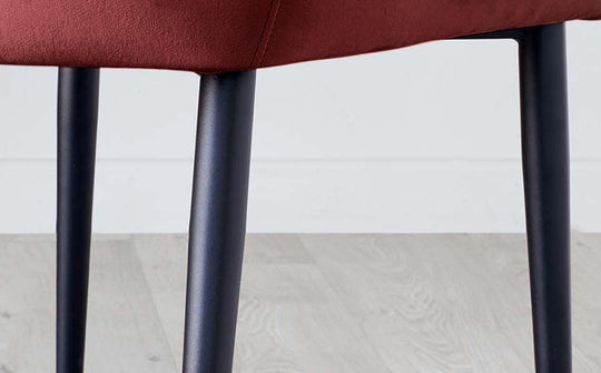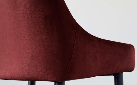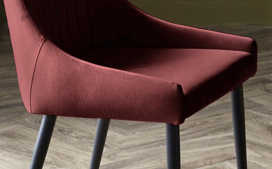 Thoughtfully designed with elegant vertical ribbing that follows the chair's graceful curves, the Blakely toffee red velvet dining chair brings warmth and sophistication to gatherings around your table. Its rich, recycled velvet upholstery in a distinctive toffee red tone ensures comfortable seating through long dinners and conversations that matter.
