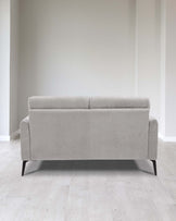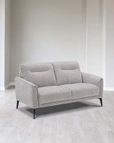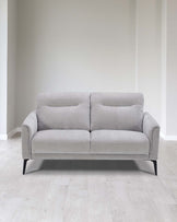 Modern light grey fabric sofa with two cushioned seats, curved armrests, and black metal legs, positioned in a minimalist white room with light wooden flooring.