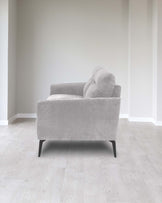 Elegant modern light grey fabric sofa with a minimalist design, featuring plush seating, straight lines, and angled dark wooden legs. Positioned on light wooden flooring against a plain light-coloured wall background.