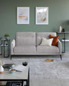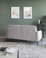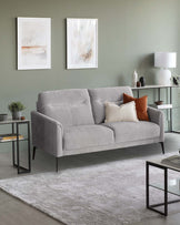 A modern living room scene featuring a minimalist, elegant three-seater sofa with a neutral grey fabric upholstery and sleek black metal legs. Accompanying the sofa is a set of two matching side tables in black with square tops and a coordinating rectangular coffee table, all displaying a selection of decorative items. The room is adorned with a light grey area rug and a pair of abstract wall paintings, enhancing the contemporary aesthetic.