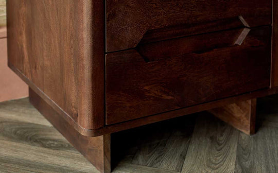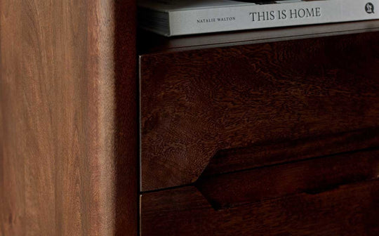 The Bryce dark mango wood 2 drawer bedside table brings warmth and sophisticated storage to your bedroom. Crafted from sustainably sourced mango wood with a rich, dark finish, it features 2 spacious drawers and an open shelf perfect for books or bedtime essentials. An instant classic that works beautifully beside any bed.