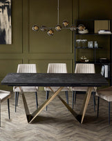 Effortlessly sophisticated, the Calenzano dark grey ceramic extending 8 to 10 seater dining table brings modern elegance to gatherings both intimate and grand. Its striking geometric pedestal base in brushed bronze metal creates visual drama whilst ensuring everyone has ample legroom. The durable ceramic top extends smoothly from 180cm to 270cm using a concealed loose-leaf mechanism, transforming your dining space in seconds.