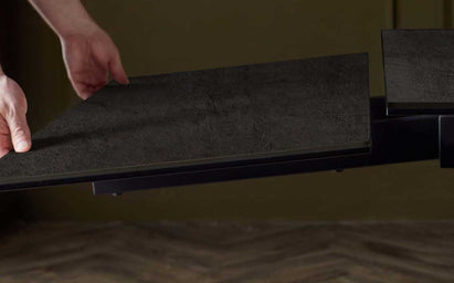Transform your dining space with the Calenzano dark grey ceramic extending table and 8 Blakely champagne velvet chairs. This sophisticated set seats 8-10 guests comfortably, with a smooth extension mechanism that adapts from intimate dinners to larger gatherings. The scratch-resistant ceramic top handles real life beautifully, while the plush velvet chairs invite long conversations over dinner.
