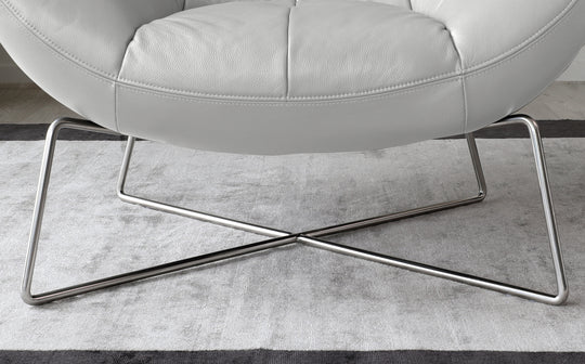 The Canio accent chair brings sophisticated comfort to any corner of your home. Upholstered in sumptuous natural grey leather with a distinctive sloping curved back, this statement piece sits on a sleek brushed steel cross-base. Perfect for creating an inviting reading nook or adding character to your living space, its medium-sit cushioning ensures hours of comfortable relaxation.