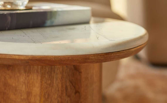 The Cara side table pairs light mango wood with a luxurious white marble top, creating a piece that's both naturally warm and effortlessly sophisticated. Its compact circular design fits perfectly beside sofas or beds, while the solid wood base provides sturdy support for lamps, books or your morning coffee. An instant classic for contemporary homes.