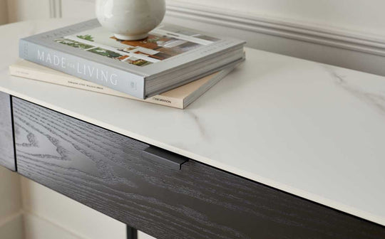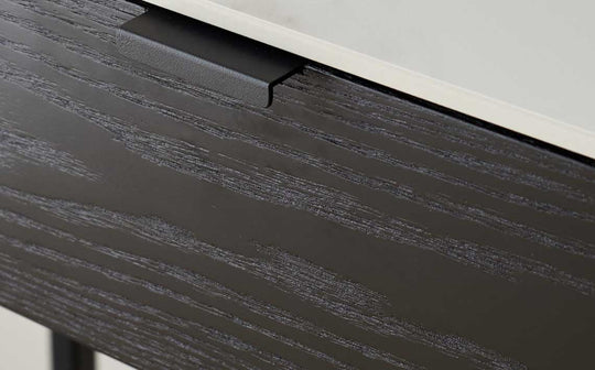 Transform your morning routine with the Carmen black console dressing table. Its striking oval silhouette and sophisticated black metal frame paired with a pristine white ceramic top create a statement piece that works beautifully as a dressing table in your bedroom or console in your hallway. A velvet-lined drawer keeps essentials organised and protected.