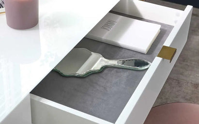 Thoughtfully designed with Art Deco curves and a crisp white finish, the Carmen dressing table transforms your morning routine into a moment of luxury. Its sleek silhouette pairs beautifully with brushed brass legs, while the spacious velvet-lined drawer keeps beauty essentials organised. Perfect for creating your own sophisticated sanctuary.