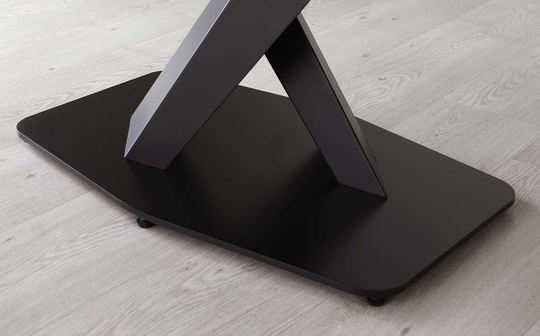 Modern dining table featuring a dark stone or concrete-style tabletop with bevelled edges and a unique, twisted X-shaped metallic base in a matte black finish. The table displays a minimalist aesthetic suitable for contemporary interior design spaces.