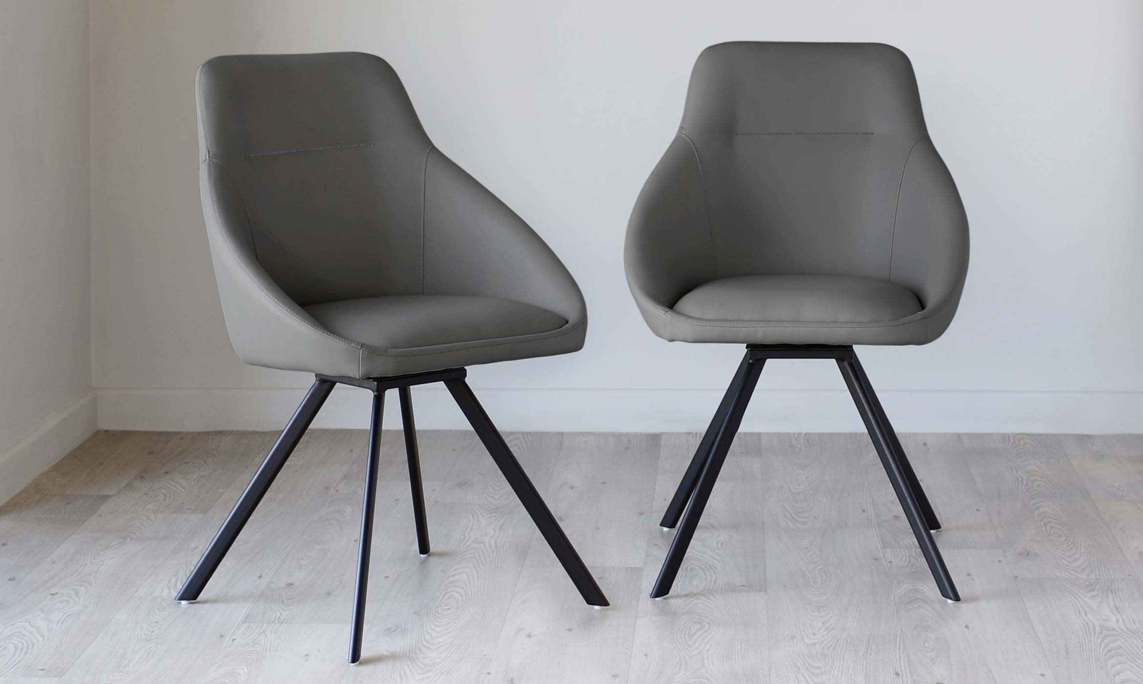 The Cleo dark grey faux leather swivel chair brings professional style to your dining space or home office without sacrificing comfort. Upholstered in soft Durosoft faux leather with a sleek curved silhouette, this chair features a 180-degree swivel mechanism and self-return function for effortless movement. The cushioned seat and supportive back ensure comfort through long working days.