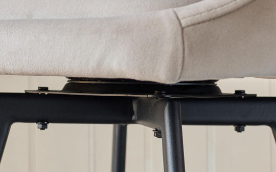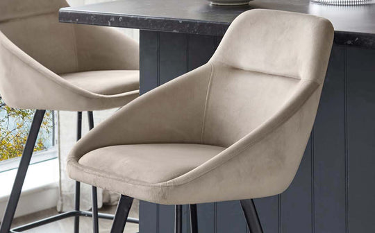 The Cleo champagne velvet swivel bar stool brings sophisticated comfort to your kitchen island or breakfast bar. Its gentle curves and soft recycled velvet upholstery create an inviting seat, while the 180-degree swivel mechanism makes conversation flow naturally. The sleek pedestal base and integrated footrest ensure both style and support for relaxed mornings or lively gatherings.