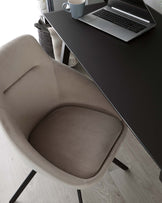 A modern office with a sleek black desk accompanied by a taupe upholstered chair featuring a rounded backrest and angled black metal legs. A laptop, a white mug, and woven basket with a white throw blanket are also arranged on the desk.