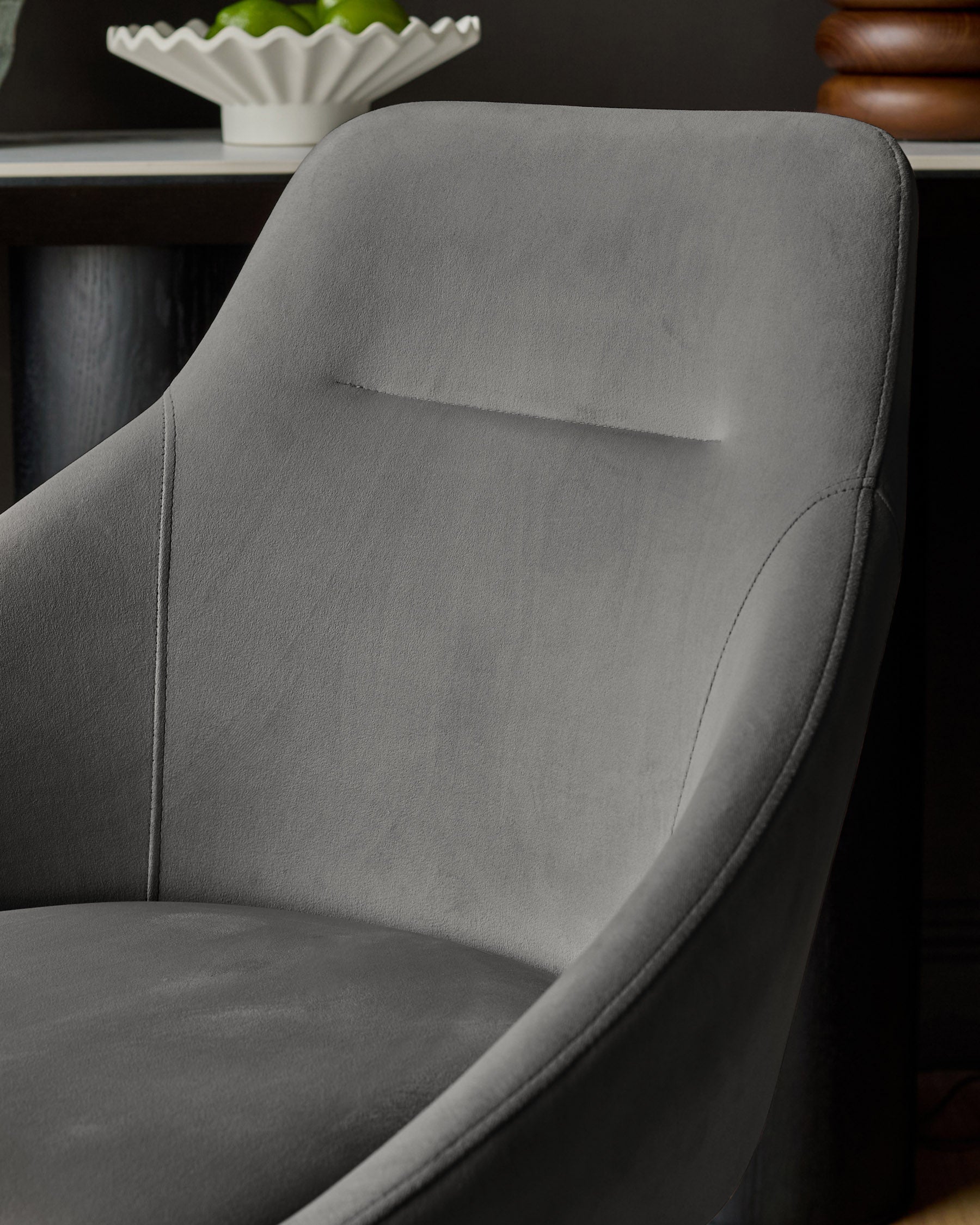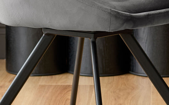 The Cleo dark grey velvet swivel chair brings sophisticated comfort to your dining room or home office. With its smooth 180-degree swivel and self-return mechanism, this versatile chair moves with you throughout your day. The plush dark grey velvet upholstery feels luxurious against your skin, while the tub-style silhouette and sleek angled metal legs create a contemporary statement piece that works beautifully around dining tables or tucked under desks.