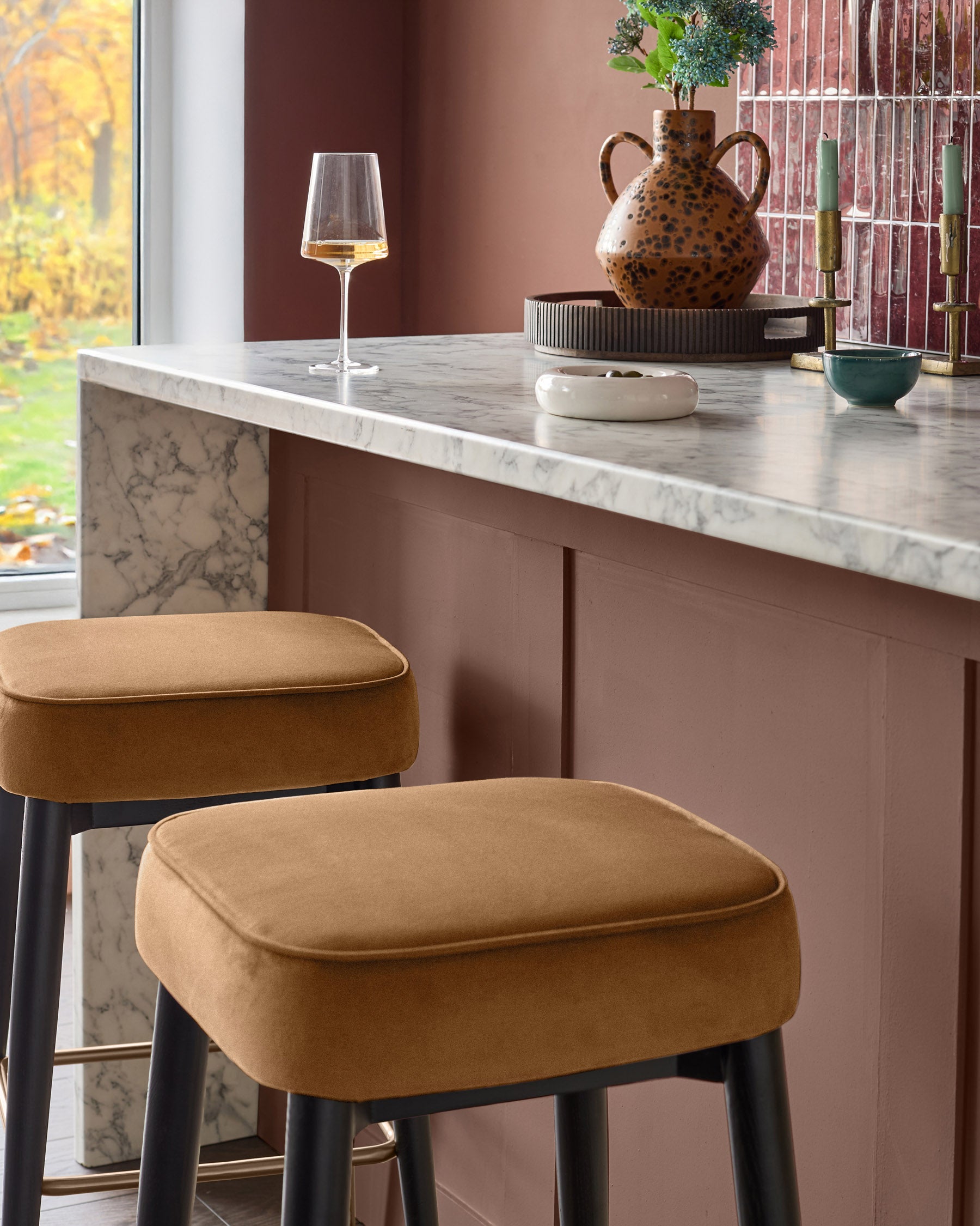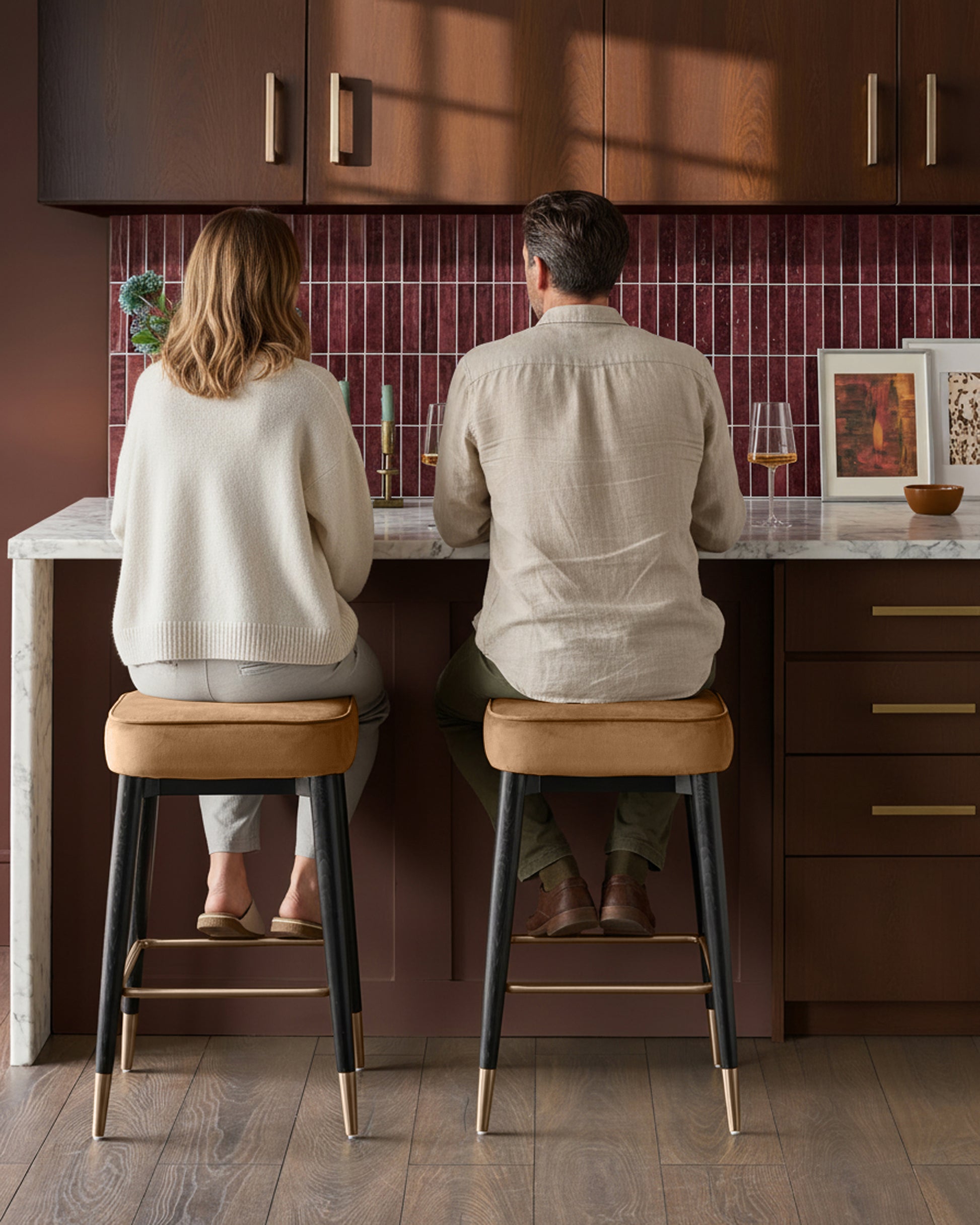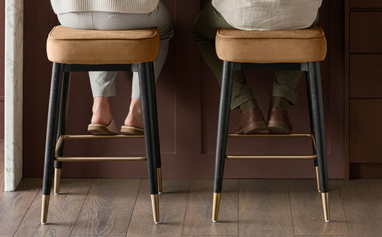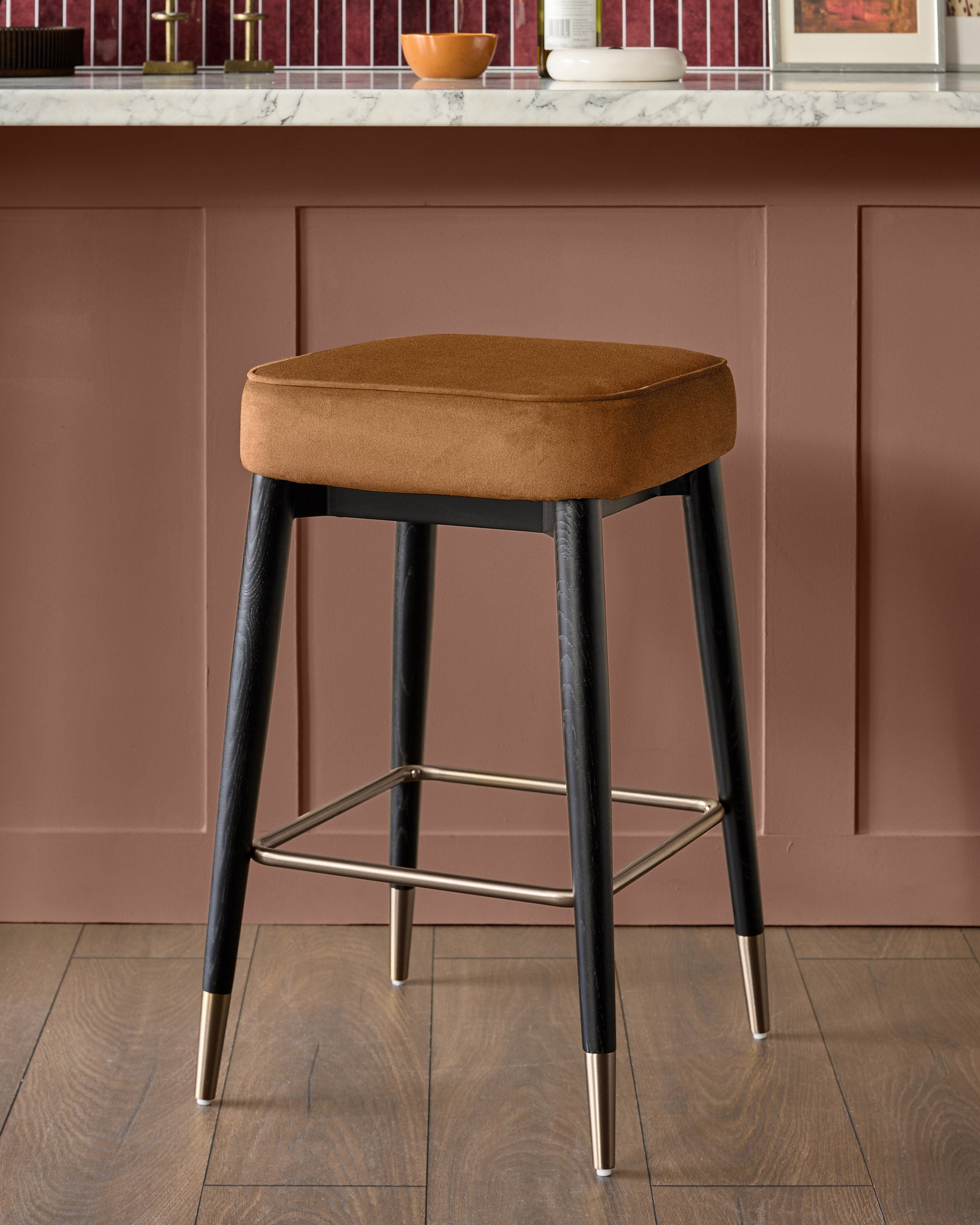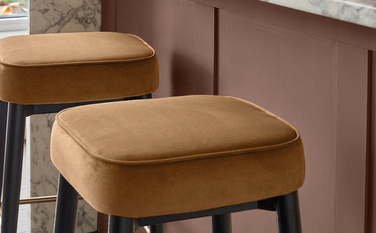 The Clover caramel fabric backless bar stool brings modern comfort to your breakfast bar or kitchen island. Its warm caramel plush fabric seat offers a soft, inviting perch for morning coffee or evening conversations. The sleek backless design tucks neatly under counters, while brushed bronze metallic accents and a matching footrest add sophisticated detail to the tapered wooden frame.
