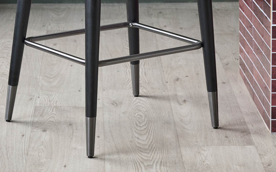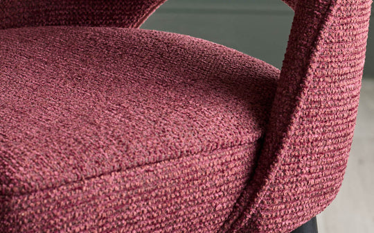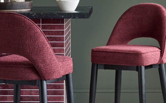 The Clover berry red chunky fabric bar stool brings confident colour and comfort to your kitchen counter or breakfast bar. Upholstered in soft, textured chenille fabric in rich berry red, this fixed-height stool features a gently curved seat and supportive back. Slim black wooden legs with gunmetal accents create a sophisticated mixed-material look that works beautifully in modern spaces.