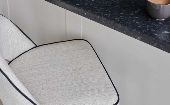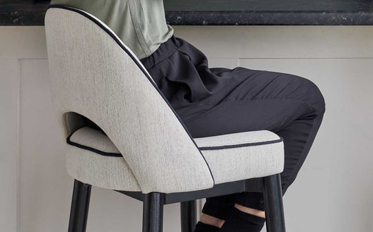 The Clover ivory dual tone fabric bar stool brings mid-century sophistication to your kitchen island or breakfast bar. Its curved backrest and cushioned seat, upholstered in luxurious ivory fabric with distinctive black piping, offer comfort for morning coffees or evening gatherings. Brushed bronze capped legs add warmth whilst adjustable floor protectors ensure stability on any surface.