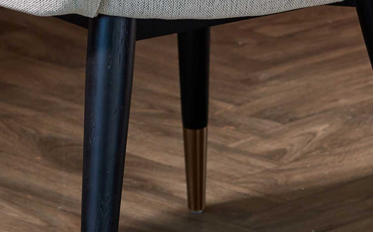 Thoughtfully designed for real life, the Clover ivory dual tone fabric dining chair brings mid-century modern style to where life gathers. The curved backrest cradles you through long dinner parties, while luxurious ivory fabric with distinctive black piping adds sophisticated contrast. Brushed bronze-capped legs complete this effortlessly elegant design. Sold in pairs for a cohesive dining space.