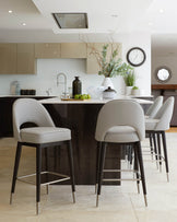 Thoughtfully designed with mid-century modern influences, the Clover light grey faux leather bar stool brings sophisticated comfort to your kitchen island or breakfast bar. The striking curved back and generously cushioned seat create an inviting spot for morning coffee or evening gatherings, while brushed metal caps on the wooden legs add refined detail.