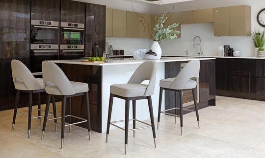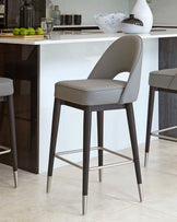 Create your perfect breakfast bar setup with the Clover bar stool. Upholstered in premium mid grey faux leather with a generously cushioned seat and curved backrest, this fixed-height stool brings mid-century style to modern kitchens. Thoughtfully designed with brushed metal leg caps and built-in floor protectors for everyday practicality.