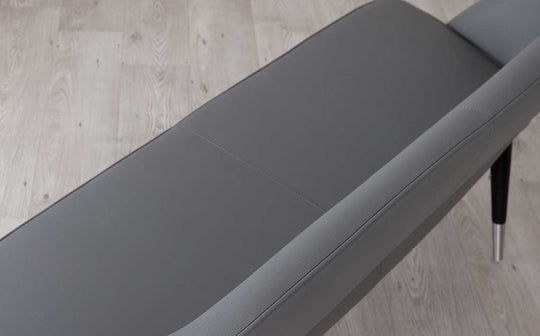 Thoughtfully designed for gatherings that matter, the Clover mid grey faux leather dining bench brings vintage charm to modern living. Its distinctive cut-out back detail and curved backrest offer comfort for up to 3 people, while brushed stainless steel capped legs add contemporary sophistication. Perfect alongside your dining table or as a stylish hallway statement piece.