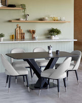Contemporary dining room with a rectangular black table with a unique X-shaped leg design, paired with four elegant light beige upholstered chairs with black legs tipped with metallic accents. A seamless blend of modern design and comfort.