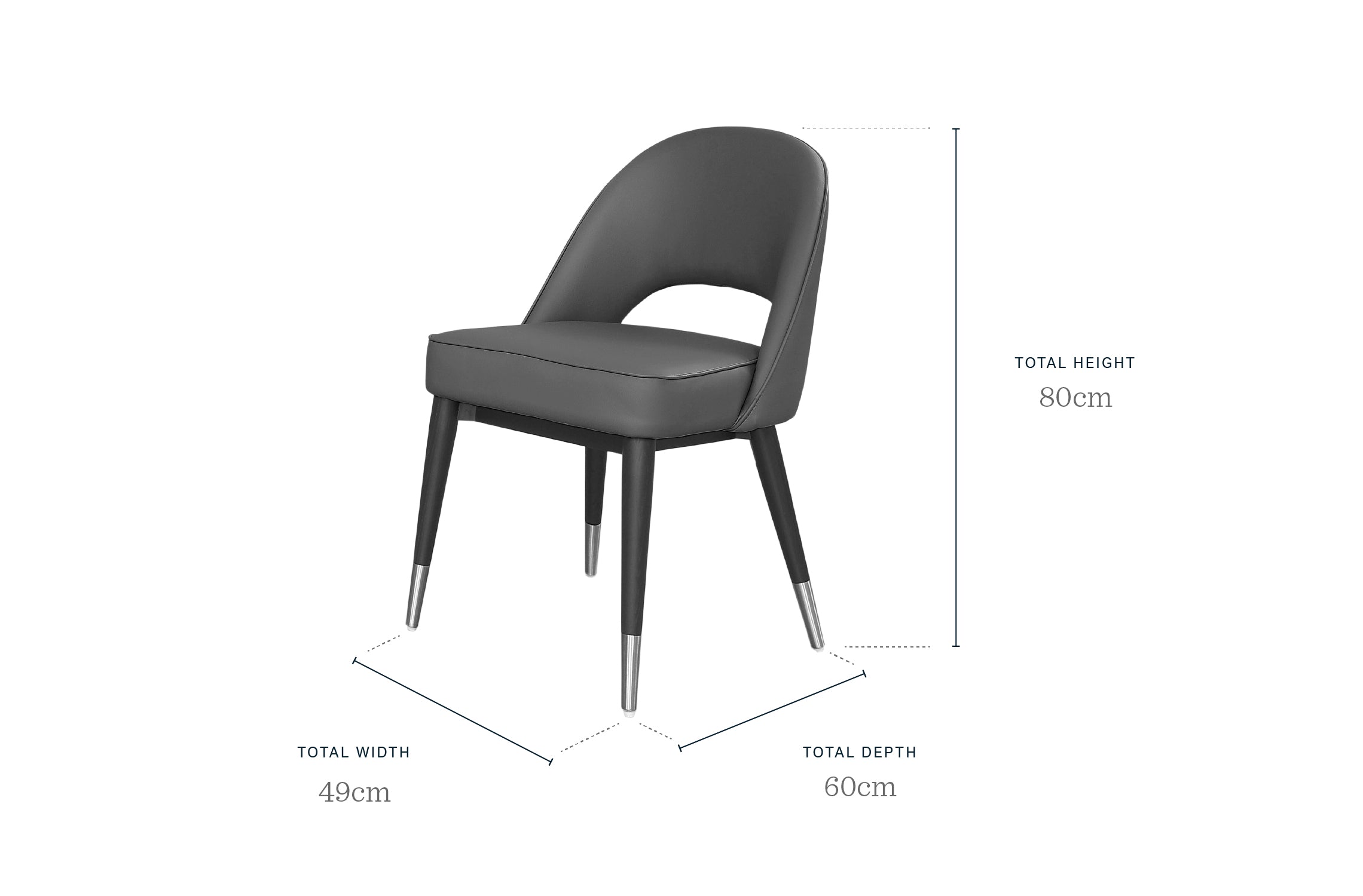 The Clover light grey faux leather dining chair brings mid-century charm to modern dining. Its curved silhouette features a distinctive cutout backrest detail, while brushed metal caps on wooden legs add refined touches. The generously cushioned seat promises comfort through long dinners, and the sophisticated light grey Durosoft faux leather works beautifully in any setting. Sold in pairs.