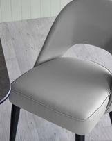 Modern, minimalist-style chair featuring a sleek, curved design with a padded grey leatherette seat and backrest, mounted on slender black metal legs. The chair offers a sophisticated aesthetic with a comfortable, supportive seating experience.