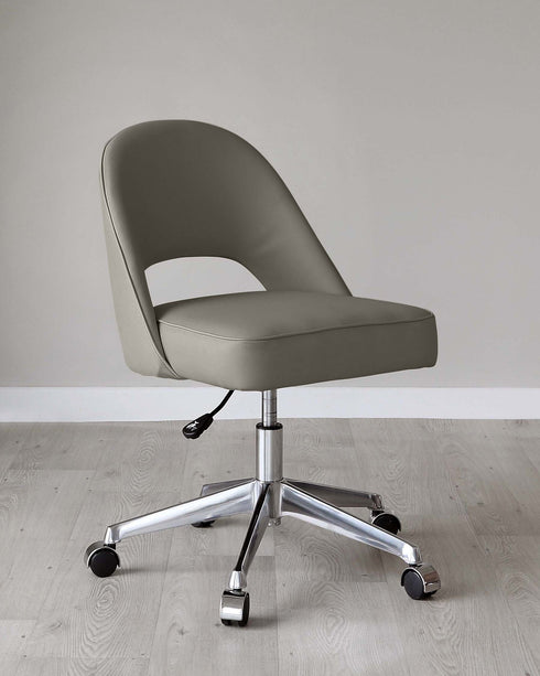Bring mid-century sophistication to your dining space with the Clover dining chair. Upholstered in premium mid grey faux leather with a gracefully curved silhouette, this chair combines timeless design with modern comfort. The thick cushioned seat and open back create an inviting spot for long dinners, while brushed metal leg caps add refined detail. Sold in pairs for effortless coordination.
