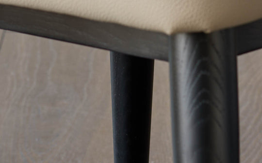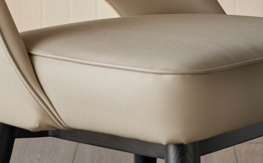 The Clover natural faux leather dining chair brings sophisticated comfort to your dining space with its smooth, flowing silhouette and creamy natural tone. The high curved back features a distinctive central cutout that adds visual interest, while the plush cushioned seat ensures everyone lingers longer over dinner. Sturdy ash wood legs with stainless steel caps complete this exclusively designed piece.