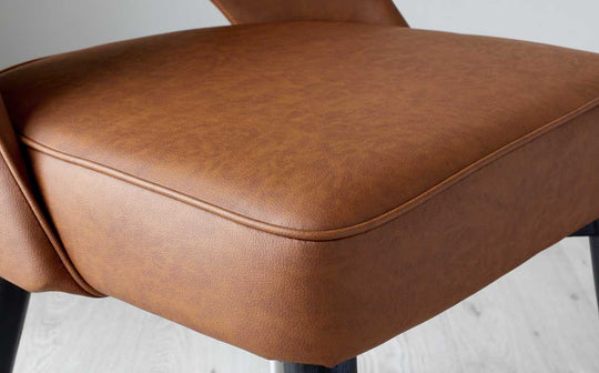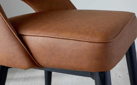 The Clover tan faux leather dining chair brings mid-century charm to modern dining. Its sculptural curved back with distinctive cut-out detail creates visual interest, while the warm tan upholstery adds sophistication to any dining space. Cushioned for comfort and sold in pairs, these chairs work beautifully around dining tables or mixed with benches for relaxed gatherings.