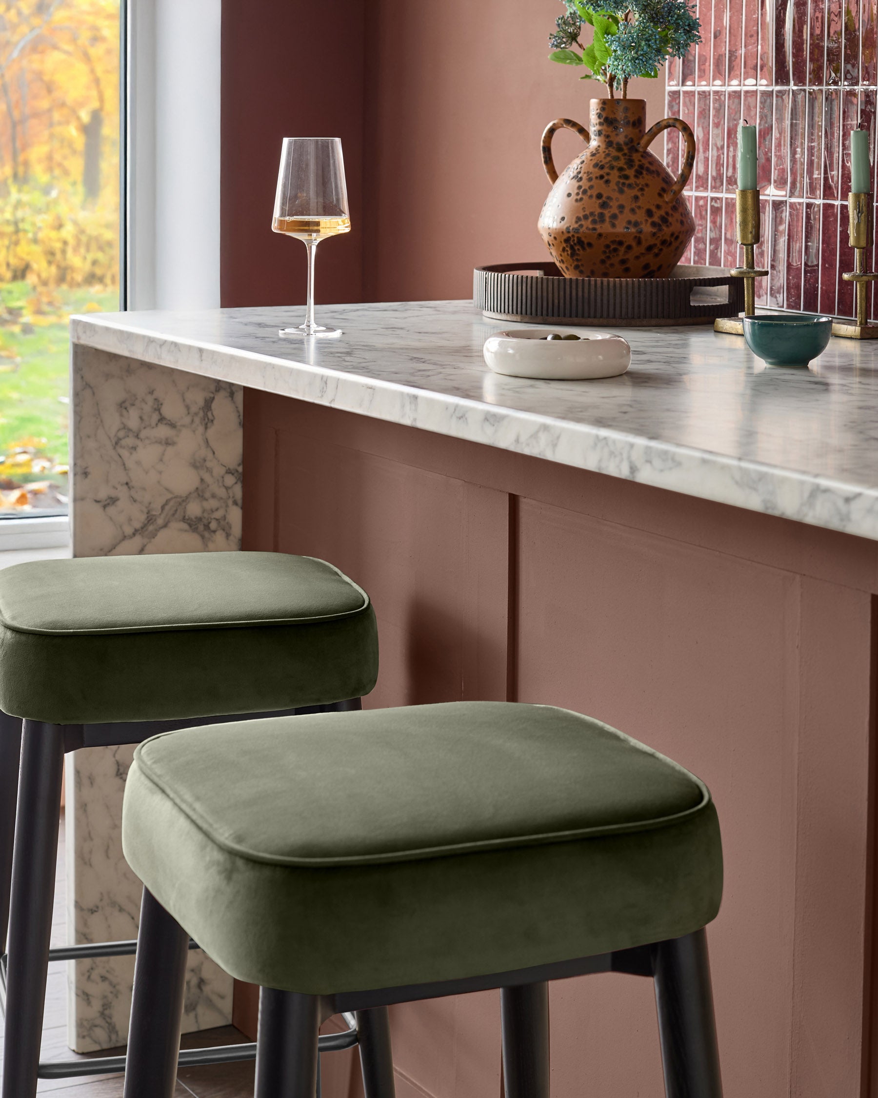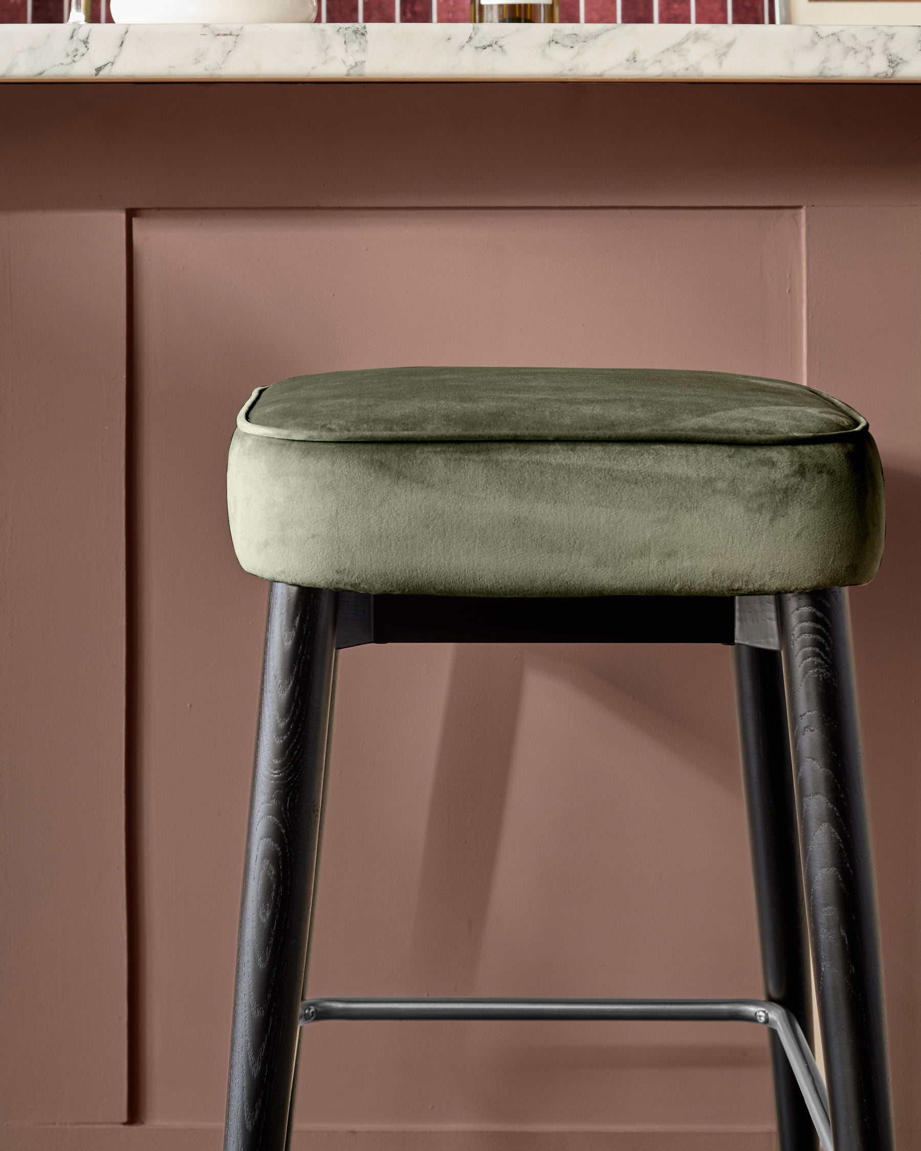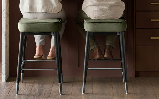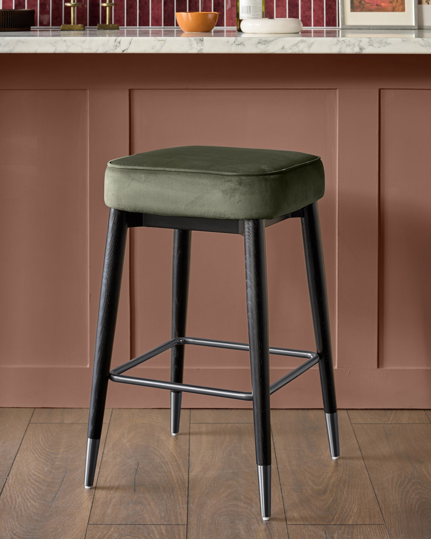 The Clover olive green velvet backless bar stool brings organic richness to your kitchen counter with its plush cushioned seat and sleek wooden legs. This thoughtfully designed piece combines recycled velvet upholstery with black stainless steel accents, creating a refined perch that's perfect for morning coffee or evening gatherings. The backless silhouette tucks neatly beneath counters whilst making a sophisticated statement.