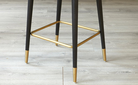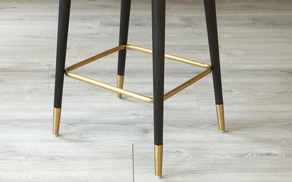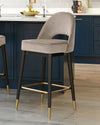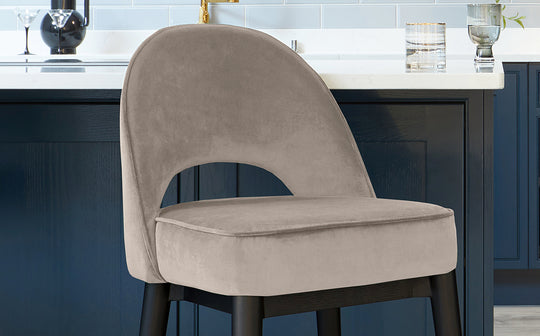 The Clover bar stool brings sophisticated comfort to your kitchen island or home bar. Upholstered in sumptuous champagne velvet with a gently curved backrest, it offers the perfect perch for morning coffee or evening drinks. Mid-century inspired wooden legs with brass caps add a touch of understated luxury that works beautifully in both contemporary and traditional spaces.