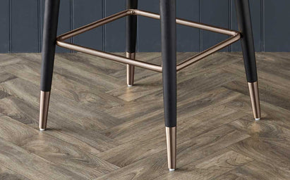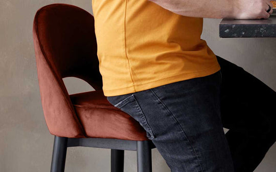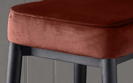 The Clover toffee red velvet bar stool brings mid-century charm to kitchen islands and home bars. Its rich recycled velvet upholstery offers luxurious comfort, while the curved backrest provides excellent support for long conversations. Black wooden legs with a brushed bronze finish create a striking contrast that complements both modern and vintage interiors.