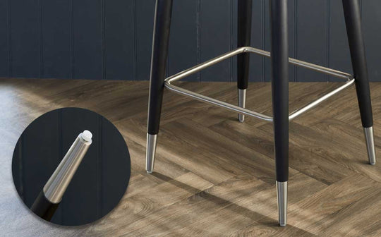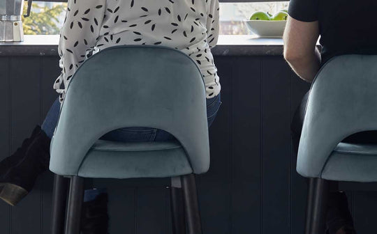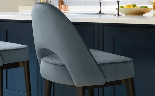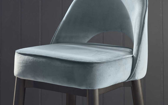 The Clover bar stool brings mid-century sophistication to your kitchen island or home bar. Upholstered in soft blue-grey plush velvet, its curved back and cushioned seat create the perfect perch for morning coffee or evening drinks. Black wooden legs finished with stainless steel caps add a contemporary edge to this timeless design.