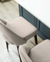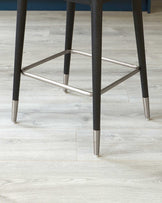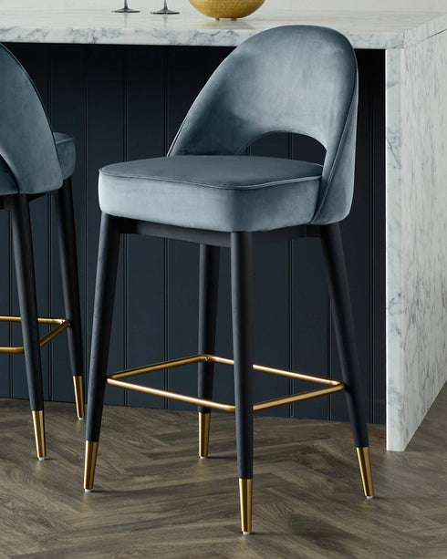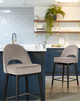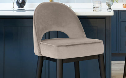 Clover champagne velvet bar stools bring mid-century sophistication to your kitchen island or home bar. The gracefully curved backrest with its distinctive cutout detail offers both style and support, while plush champagne velvet upholstery adds a luxurious touch. Sturdy wooden legs finished with stainless steel caps create a refined foundation that complements both contemporary and classic interiors.