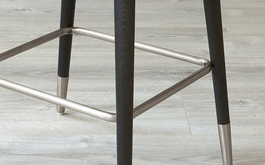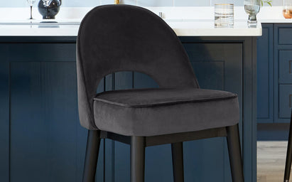 The Clover dark grey velvet bar stool brings sophisticated comfort to your kitchen island or breakfast bar. Upholstered in plush dark grey velvet with a supportive curved backrest, this mid-century inspired design features a distinctive cutout detail. Sleek wooden legs capped with stainless steel add refined elegance, while the cushioned seat ensures comfortable lingering over morning coffee or evening cocktails.