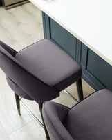 Elegant pair of upholstered bar stools with plush, curved backrests and cushioned seats in a rich, dark grey velvet fabric. The stools stand on sleek, black metal legs with a subtle flare and incorporate a circular, all-around footrest for added comfort. The sophisticated design aligns with a modern kitchen interior, complementing the deep blue cabinetry and warm wooden accents.