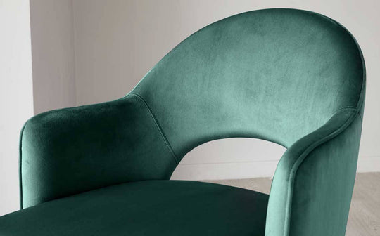 The Clover dark green velvet and brass dining armchair brings sophisticated comfort to your dining space. Perfect for positioning at either end of your table, this armchair features sumptuous dark green velvet upholstery and gleaming brushed brass legs. The cushioned seat and backrest offer exceptional support, while the open back design adds contemporary flair to any dining room.