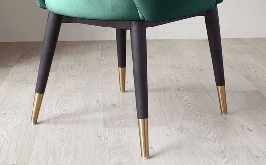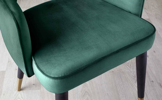 The Clover dark green velvet and brass dining armchair brings sophisticated comfort to your dining space. Perfect for positioning at either end of your table, this armchair features sumptuous dark green velvet upholstery and gleaming brushed brass legs. The cushioned seat and backrest offer exceptional support, while the open back design adds contemporary flair to any dining room.