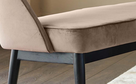 The Clover champagne velvet dining bench brings living room comfort to your dining space with its luxurious upholstery and thoughtful design. Perfect for creating a relaxed dining atmosphere, this 3-seater bench features a distinctive cut-out backrest that provides support whilst maintaining an open, airy feel. Style it around your dining table or as a statement piece in your hallway.