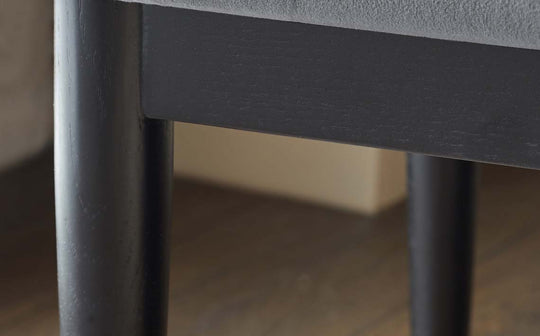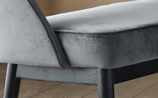 The Clover dark grey velvet dining bench with backrest offers a modern twist on a mid-century classic. Its vintage-inspired charm is elevated with plush velvet upholstery, a cut-out back detail, and a curved backrest for added comfort. Brass-capped wooden legs complete the look, adding a touch of understated elegance. Seating up to 3 people comfortably, this versatile bench is designed to complement the Clover dining table and chairs, creating a cohesive and stylish dining space. Alternatively, place it in a hallway or living room as a standalone statement piece, adding a touch of sophistication and practicality.Details
