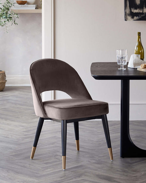 The Clover mocha velvet dining chair brings mid-century style to modern dining rooms. Upholstered in rich mocha velvet, this chair offers luxurious comfort for long dinner parties and lazy Sunday brunches. The brushed bronze-capped wooden legs add vintage glamour, while built-in adjustable floor protectors keep your floors pristine. Sold in pairs for coordinated style.